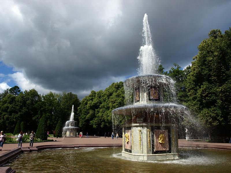 Перед каскадом «Шахматная гора» находится площадь, которая является основой в планировке восточной части Нижнего парка. На ней и стоят два совершенно одинаковых фонтана Римскими в Санкт-Петербурге. Ещё в 20-х годах XVIII века устройство этих фонтанов предусматривал проект Н. Микетти. Однако
